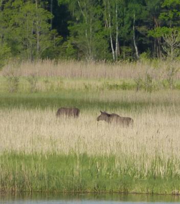 Und tatsächlich stehen zwei Elche gegenüber im Schilf. Fernglas gezückt und der Foto klickt , klickt, klickt,,,,,,,,, .